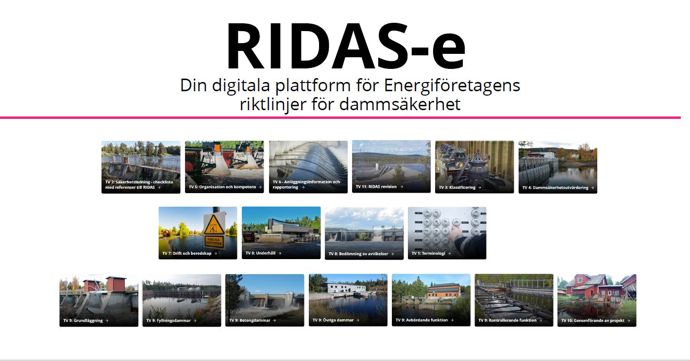 Energiföretagens riktlinjer för dammsäkerhet - RIDAS - utgör grund för dammsäkerhetsarbete enligt god praxis för medlemsföretagen vad gäller arbetsmetoder och tekniklösningar och kan även utgöra stöd för myndigheter, konsulter och entreprenörer. RIDAS-e är en digital plattform som ger tillgång till huvuddokument och tillämpningsvägledningar i syfte att stödja dammsäkerhetsarbetet. Målgruppen är alla som arbetar med dammsäkerhet inom vattenkraftindustrin.